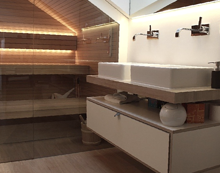 Neugestaltung, Umbau und Innenausbau eines Dachgeschosses zum Elternapartement mit angeschlossenem Wellnessbereich, Sauna und freistehender Badewanne. Umzonierung des Wohn-, Küchen- und Eingangsbereiches, sowie Umgestaltung durch indirekt beleuchtete Wandverkleidungen und integrierten Glas- und Drehtüren.