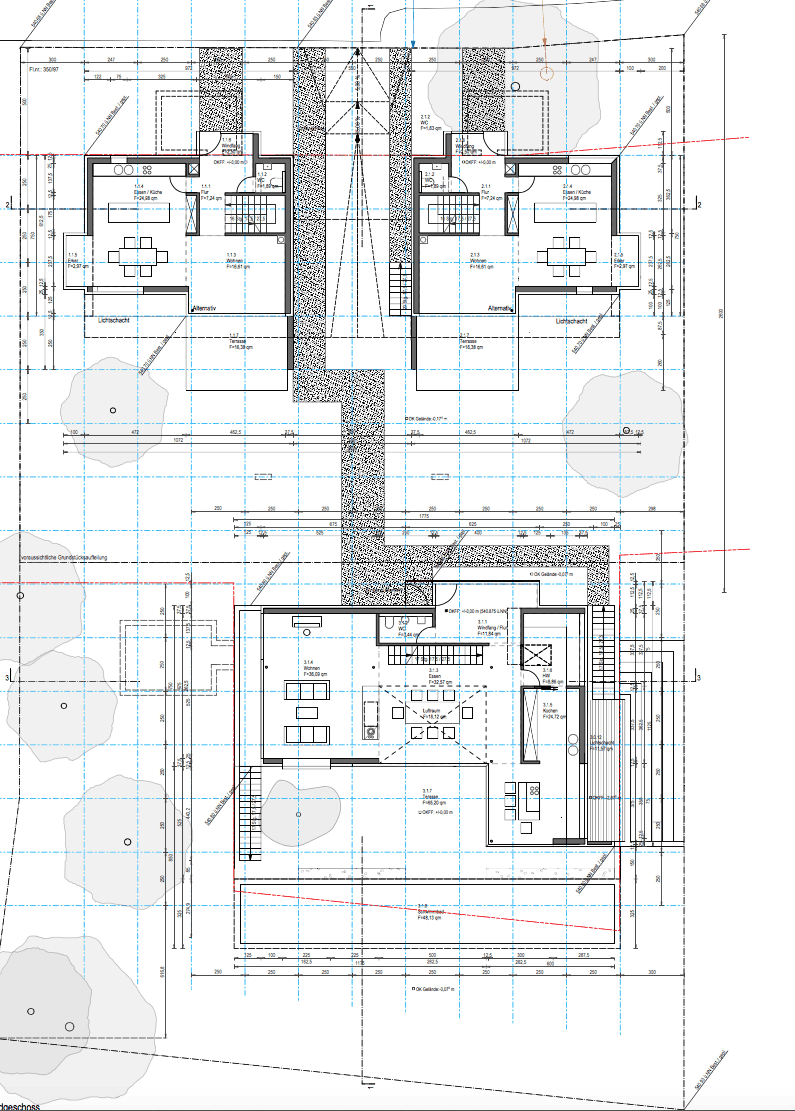 Entwurf und Planung eines Wohnhausensembles in Gräfelfing, bestehend aus einer Einzelvilla und zwei Doppelhaushälften mit gemeinsamer Tiefgarage. Das gebotene Baurecht wird optimal ausgenutzt. Die Wohnungen bieten großzügig geschnittene Grundrisse mit Loggien und Dachterrassen die differenzierte Außenräume bilden. Klare Strukturen der Gebäudekubatur prägen den markanten Entwurf der beiden spiegelsymetrischen Gebäudekörper.