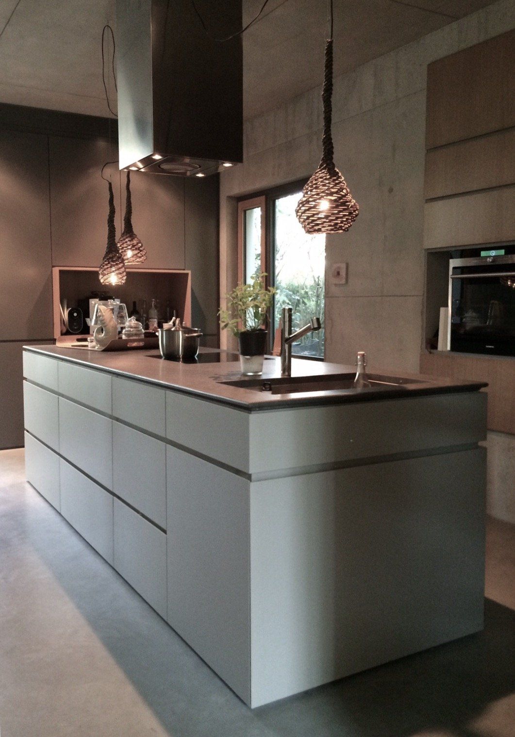 An der Arbeitsfläche aus offenporigem Sandstein und großem Edelstahlbecken, steht man sich kommunikativ beim Kochen gegenüber. Raumhohe, wandbündige Schränke mit
