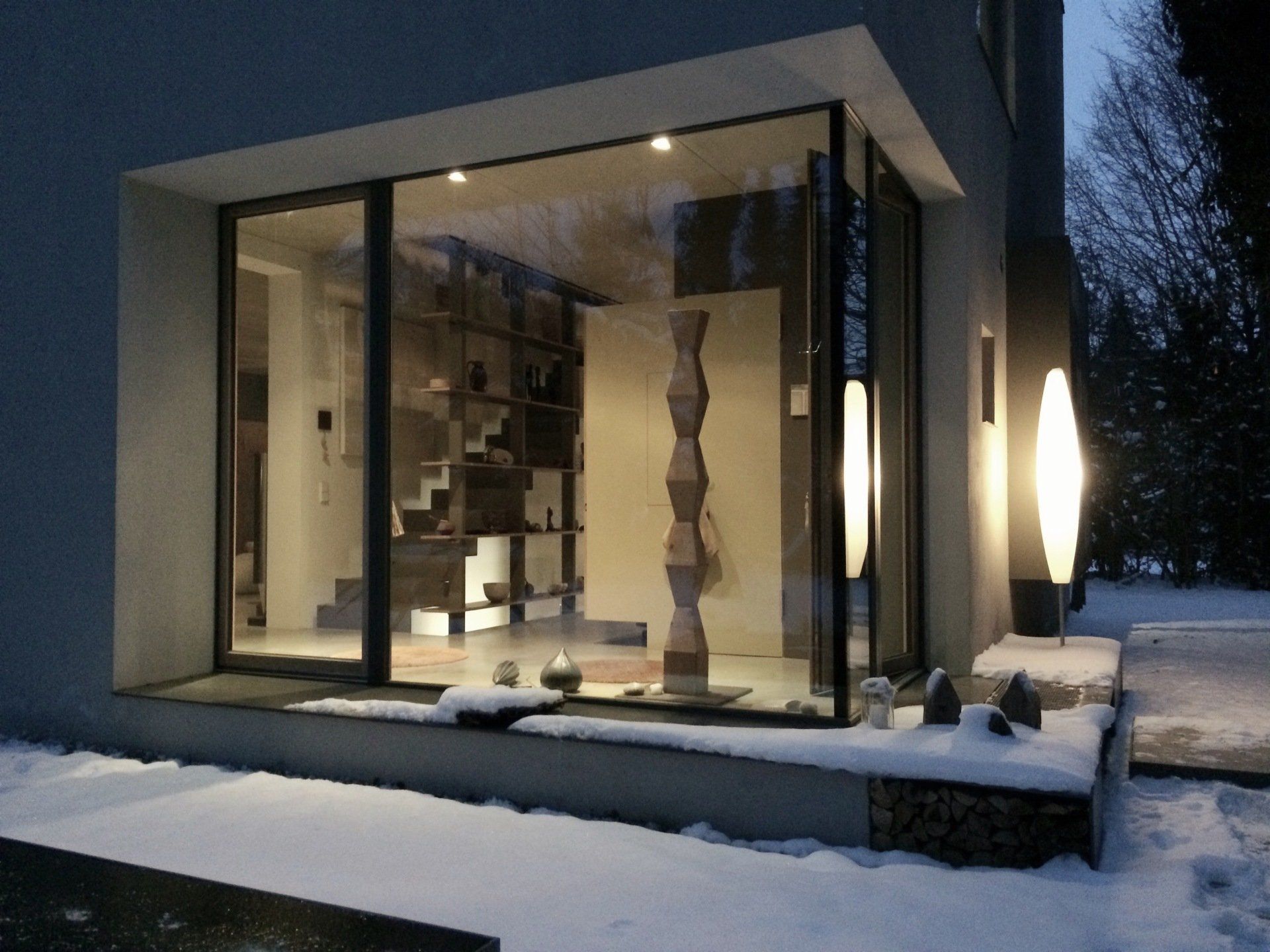 Erschlossen wird der Innenraum über eine einläufige Stahltreppe. Wie aus einem Stück Blech gefaltet windet sie sich vom Keller bis ins Staffelgeschoss. Sie ist das zentrale Gestaltungselement. In Ihrer Mehrfachfunktion nicht nur Treppe sondern raumgreifendes Regal, Bibliothek und überdimensionaler Setzkasten.