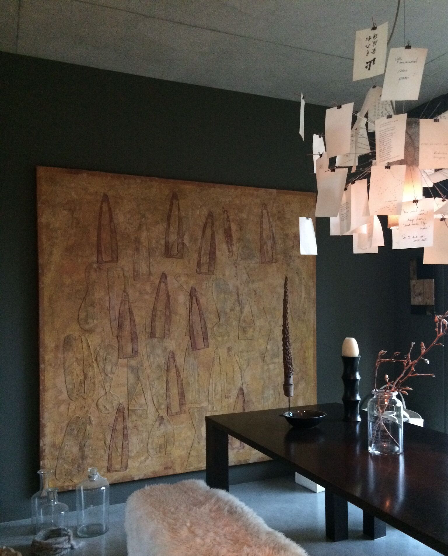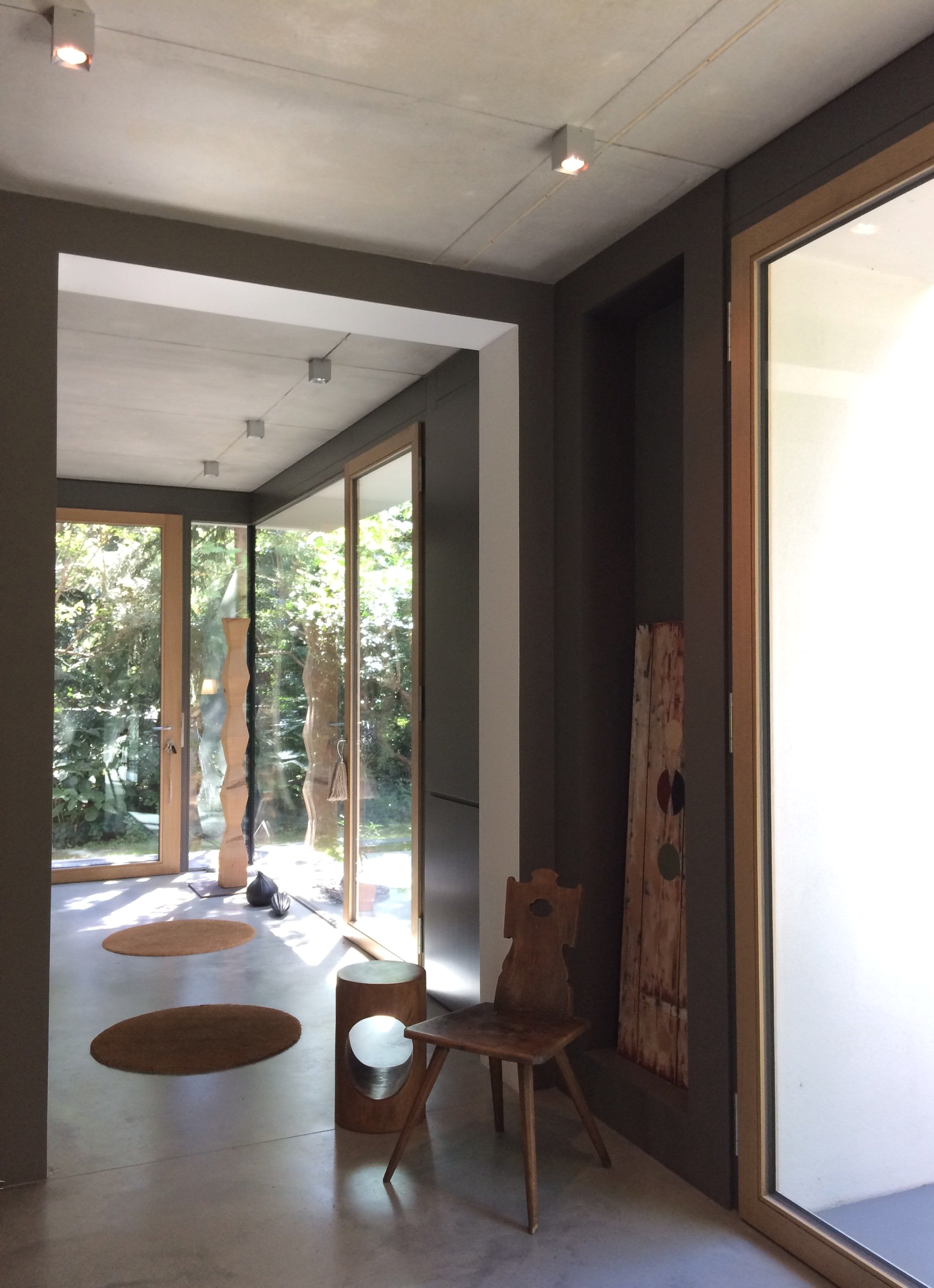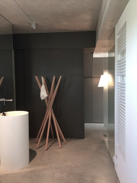 Grautöne in allen Stufen grundieren die Stimmung der Räume, wobei die Materialien originär wirken. Vor allem Sichtbeton kommt an den Wänden und Decken pur zur Geltung, steigert die Wirkung von wohldosiert eingesetzter Eiche und bildet zudem ein spannendes Umfeld für ausgesuchte Kunst. Felle, Textilien, Bilder, Leuchten und Objekte reichern die asketisch puren Räume mit Naturakzenten, Lichtblicken und Stilleben an, die zudem sparsam und feinfühlig arrangiert sind und Professionalität bezeugen.