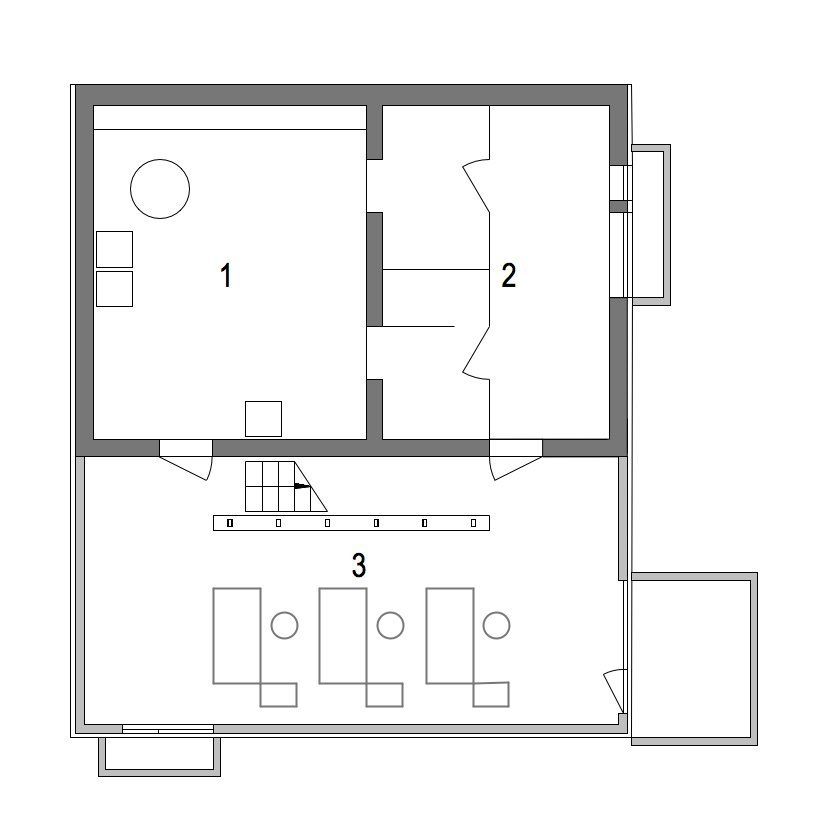 Der Innenraum folgt der reduzierten Architekturhaltung. Verputzte Flächen kontrastieren mit kargen unbehandelten Sichtbetonwänden und -decken sowie geglätteten Sichtestrichböden.