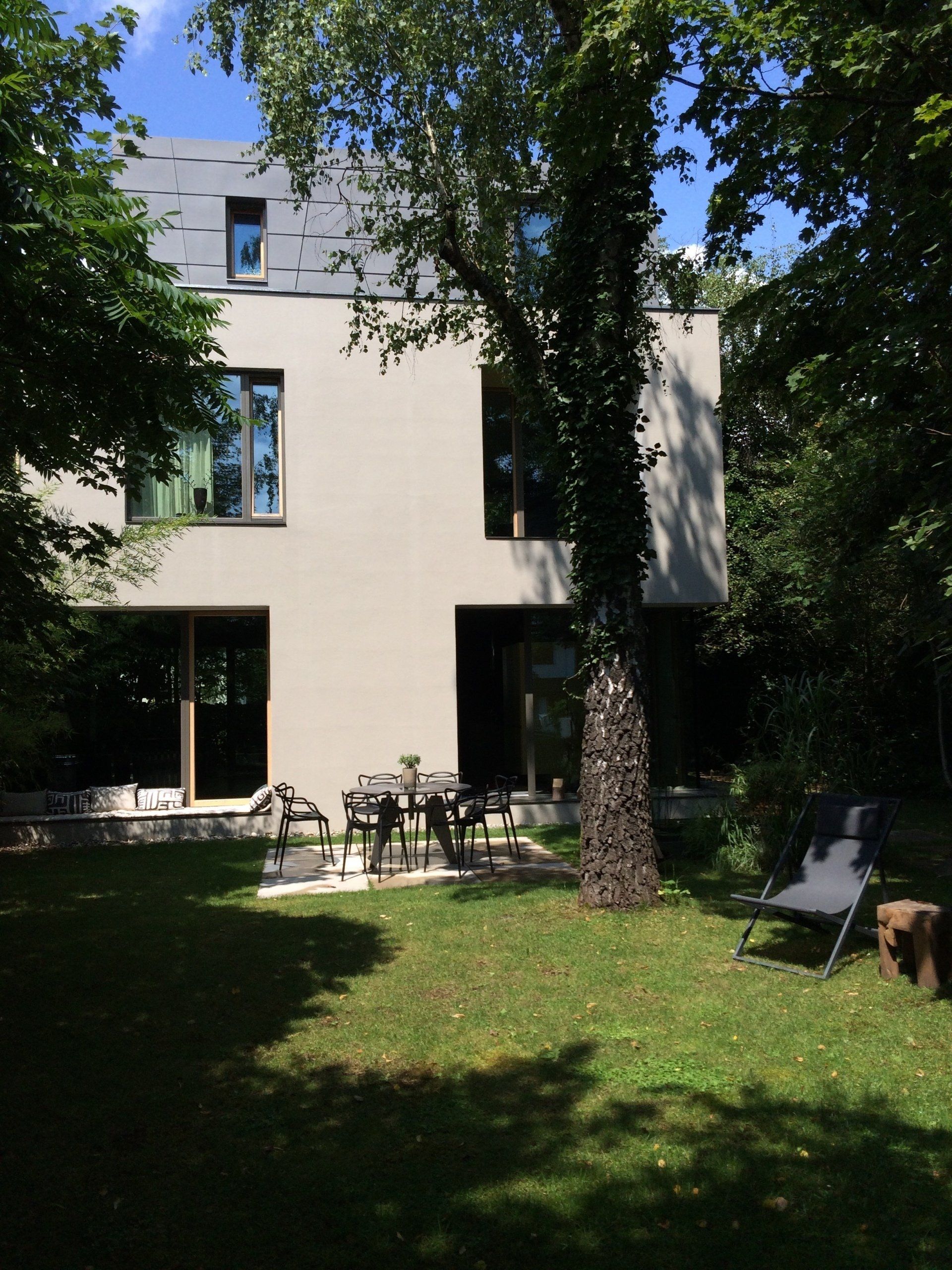 Der Baukörper zeigt sich als reduzierter, warmgrau verputzter Kubus mit groß dimensionierten dunkelgrauen Fensterelementen und Öffnungsflügeln aus heimischer Eiche.